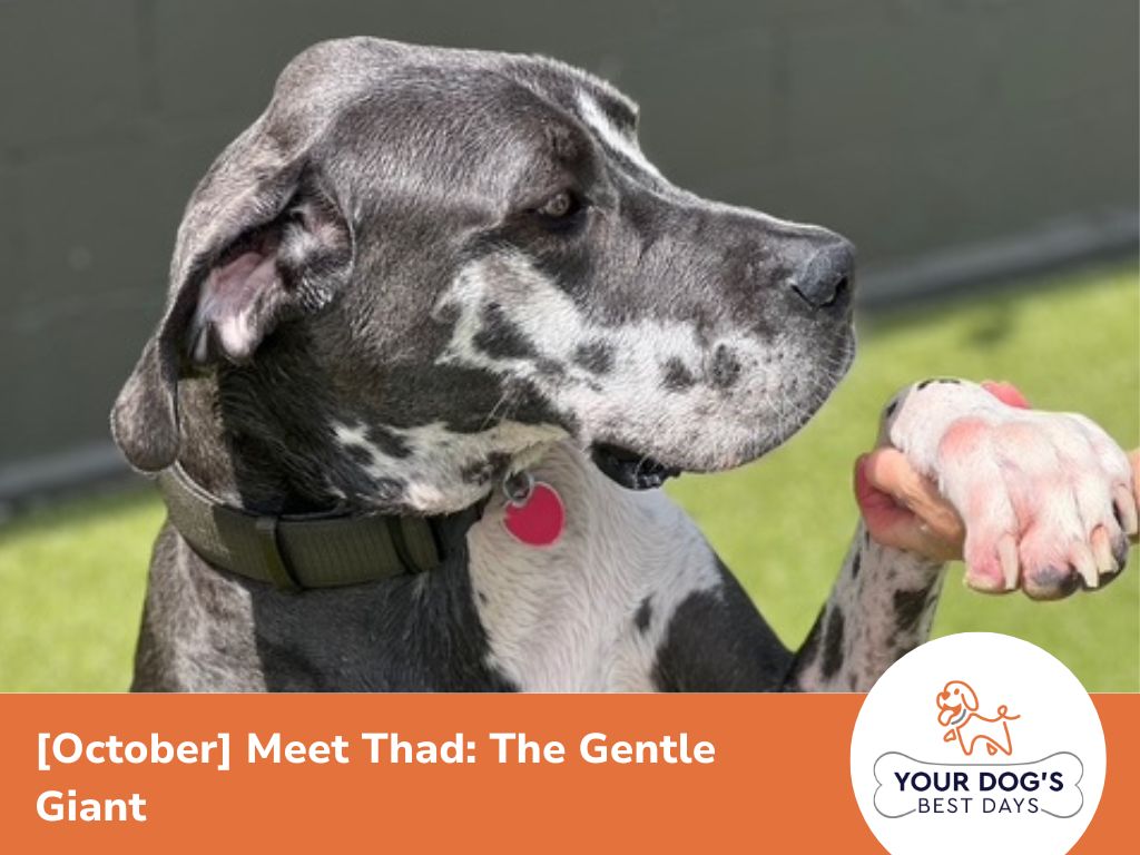 Some dogs stand out because of their size — others because of their heart. Thad has both.Weighing in at a “small” 150 pounds, this calm and gentle boy is the…